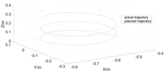 Figure 18 shows the actual run in Cartesian space. It could be seen that the actual motion trajectory coincided with the planned motion trajectory. The mean square error of the two tracks was calculated to be 7.8265 × 10−10 m. This data shows that the error between the actual trajectory and the target trajectory was extremely small. This shows that the inverse solution of the robot had higher accuracy.