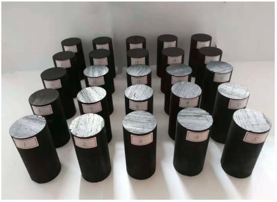 A coal block sample was taken from the Tazigou Coal Mine (Fuxin, China), and the coal type is lean coal. The detailed properties of the coal sample are shown in Table 1. First, cylindrical coal specimens were drilled with a diameter of 50 mm perpendicular to the coal seam bedding plane. Then, coal specimens were cut to a height of 100 mm by a cutting machine. Last, coal specimens with a diameter of 50 mm and a height of 100 mm were polished with a grinding machine. The ends of the specimens and diameter deviations along the specimens’ axis met the standard suggested by the International Society for Rock Mechanics []. A total of twenty-five specimens were divided into five groups, each group had five specimens (see the specimens in Figure 1).