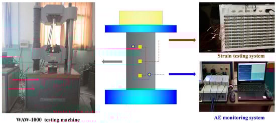 The testing system was mainly composed of three parts. The WAW-1000 electro-hydraulic servo testing machine was used for the application of uniaxial compression. The CM-2B Strain Testing System is made by Xinheng Electronic Technology Company, Qinhuangdao City, China. And it was used to collect the strain data of the coal specimens. The DS5-8B Acoustic Emission Monitoring System is made by Beijing Softland Times Scientific & Technology Company, Beijing, China. And it was used to monitor the AE number and AE energy during the coal specimens’ compression. The testing equipment is shown in Figure 2.