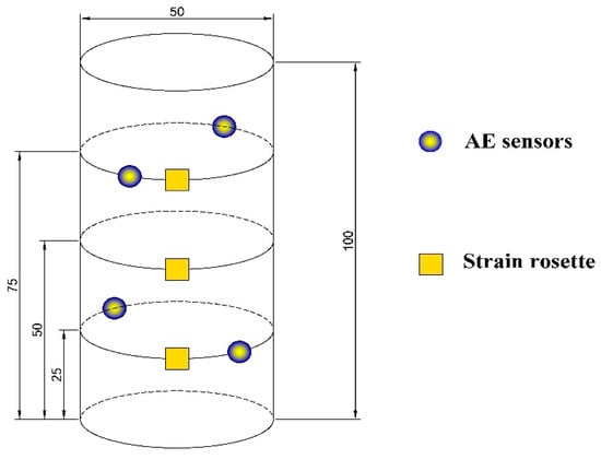 Four acoustic emission sensors with a diameter of 18 mm (RS-2A) were placed on the surface of the specimens. The two sensors’ center position was 25 mm from the lower end of the coal specimens, and the other two sensors’ center position was 25 mm from the upper end of the coal specimens. Four acoustic emission sensors were coated with Vaseline to ensure the coupling effect. Then they were attached to the surface of the coal specimens by scotch tape. The specific arrangement of the strain rosette and acoustic emission sensor is shown in Figure 3.