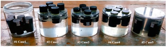 Five groups of coal specimens with different water-soaking heights (0 mm, 25 mm, 50 mm, 75 mm, 100 mm) were prepared for the tests, which are listed in Table 2 and shown in Figure 4.