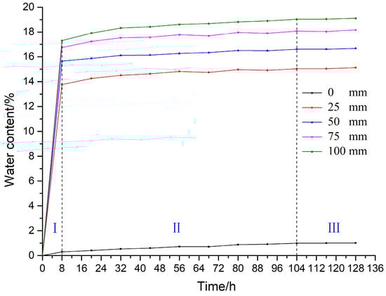 In order to study the influence of the soaking height on the water absorption law of coal specimens, the water-soaking tests of the coal specimens under five different soaking heights were carried out. The results are shown in Figure 5. In the Figure, the abscissa is the water-soaking time of the coal specimen, and the ordinate is the water content of the coal specimen. The water content is calculated using the following formula (ISRM, 1979 []):