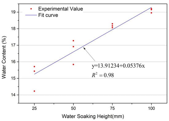The water content data of coal specimens with water-soaking heights of 25 mm, 50 mm, 75 mm, and 100 mm were linearly fitted (Figure 6). It was found that there is a good linear fitting relationship between the final moisture content of the coal specimen and the soaking height. The fitting relationship is expressed in Equation (2):