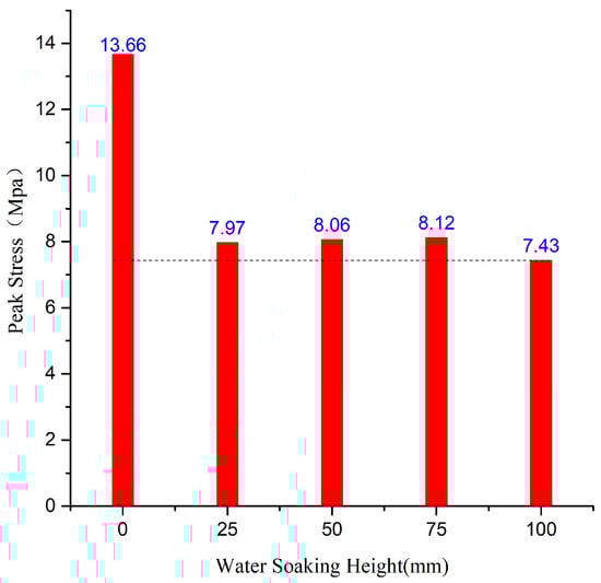To reduce statistical effects on the experimentally measured mechanical properties, compression experiments with the same loading conditions were performed on five specimens for each water-soaking height []. And, we removed the maximum and the minimum values from the test data of each group, the results of the remaining three coal specimens tests in each group were used for subsequent analysis.