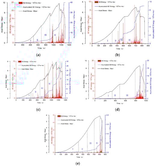Stress–time, acoustic emission energy–time, and acoustic emission cumulative energy–time curves. (a) 0 mm water-soaking height; (b) 25 mm water-soaking height; (c) 50 mm water-soaking height; (d) 75 mm water-soaking height; (e) 100 mm water-soaking height.
