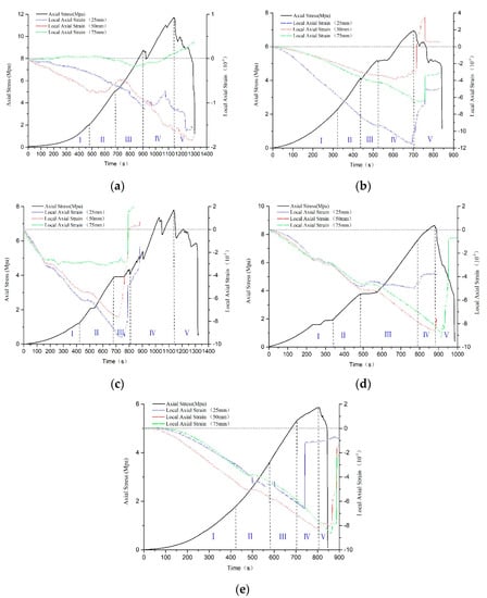 Evolution of the axial stress and local strain for different soaking heights specimens at different loading times. (a) 0 mm water-soaking height; (b) 25 mm water-soaking height; (c) 50 mm water-soaking height; (d) 75 mm water-soaking height; (e) 100 mm water-soaking height.
