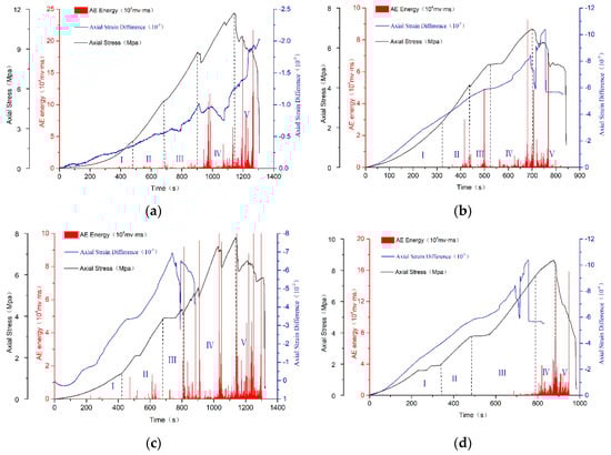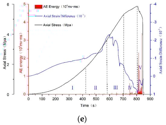 Furthermore, the axial strain difference was analyzed combined with the overall stress and the acoustic emission energy. Figure 12 shows local strain difference–time, stress–time, acoustic emission energy–time curve.