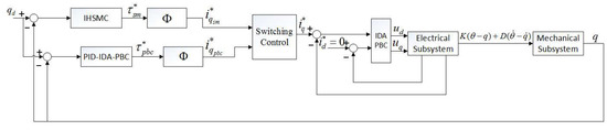 In this section, we uses double closed-loop control. The outer loop is a position loop, and two position controllers are designed according to the IHSMC and PID-IDA-PBC algorithms, respectively. In order to realize the advantages of the two control algorithms, the Gaussian function is adopted as the switching function, and the smooth switching is performed according to the rate of change of the position error. For the purpose of simplifying the controller design, we use a surface PMSM as the servo motor. In order to achieve current tracking control, this paper will use the IDA-PBC control strategy as the current controller. The system diagram of the hybrid control system is as follows in Figure 1.