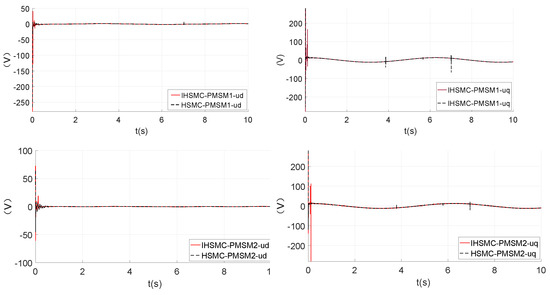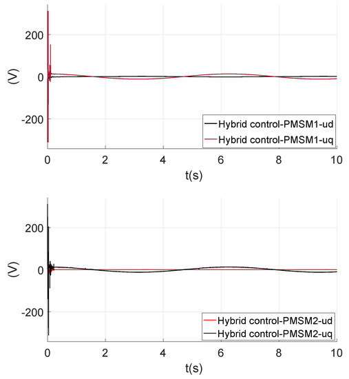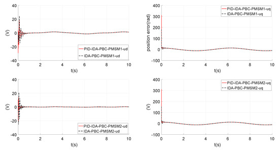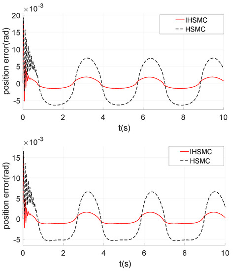 In this section, we will verify the control algorithm proposed in Section 3 by simulation. In order to facilitate the simulation, we consider 2DOF flexible manipulator as the controlled object. Firstly, the IHSMC algorithm proposed in this paper is simulated and compared with the traditional HSMC algorithm. The superiority of the control strategy is verified. Then, a PID-IDA-PBC proposed in this paper is simulated and implemented with the IDA-PBC algorithm. In comparison, it is verified that the PID-IDA-PBC algorithm has better steady state performance and disturbance–resistance ability. In the end, we proceed simulations using hybrid control. We use the parameter values of robot manipulator reported in [29]. In this simulation we assume that each joint of the flexible-joint robot is driven by PMSM. The parameters of PMSM are given as . The initial state is set as , we require the expected position vector to be . Lastly, we agree that the counterclockwise direction is the positive direction of the rotation of robot.