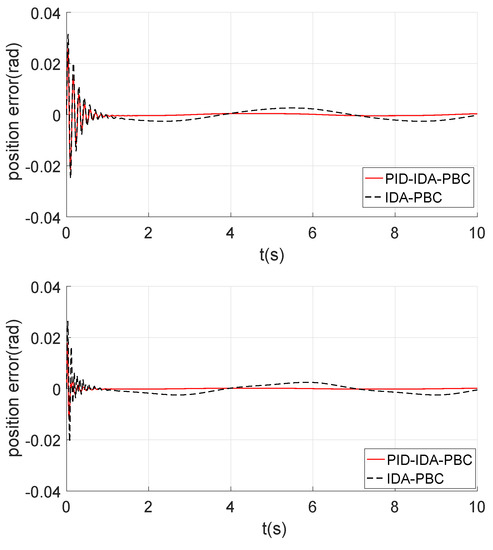 The simulation experiment of the PID-IDA-PBC algorithm is divided into two parts. Firstly, the performance difference between the algorithm and the traditional IDA-PBC algorithm is compared without disturbance. Then, a constant value disturbance signal of 2 N·m is added at the System dynamic Equation (2) at 4 s to verify the disturbance–resistance performance of the algorithm. Parameters of PID-PBC-PCH controller: . According to Figure 4, it can be concluded that the PID-IDA-PBC has improved dynamic performance and steady-state performance compared to the conventional IDA-PBC control. The PID-IDA-PBC control algorithm can improve the steady-state performance by adjusting v. Figure 5 shows the simulation curves of under IDA-PBC and PID-IDA-PBC method. At the same time, it will reduce the dynamic performance. In order to validate the robustness of the PID-IDA-PBC algorithm, constant-size perturbations of different sizes are added to the drive motors of joint 1 and joint 2 at 4 s. The result is shown in Figure 6. The PID-IDA-PBC algorithm has excellent disturbance–resistance performance.