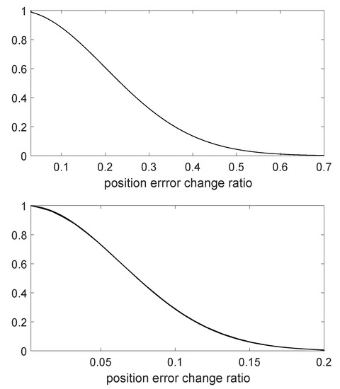 The use of the position error change ratio as a basis for smooth switching is considered to be that the faster the error convergence speed for a stable system, the higher its response rate. For the trajectory tracking system, a higher the position error change ratio means a faster the response rate and when the system enters the steady-state, we expect the position error to change slowly and gradually approach zero. Hence, the switching interval is selected and the size of the switching function parameter is adjusted according to the rate of change of the position error. In the steady state, due to the high-frequency small chattering caused by the disturbance, the hybrid control process is newly entered until the chattering is eliminated. Hence, when , the IHSMC control strategy is adopted to improve the dynamic performance of the system; when , the PID-IDA-PBC control strategy is used to improve the control accuracy and anti-interference ability of the system; when , the smoothing switch is realized by smoothing function.
