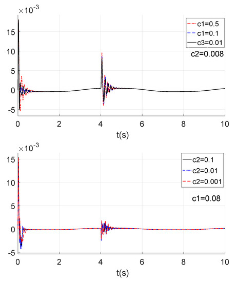According to the simulation results in Figure 7, it can be concluded that the hybrid control strategy combines the advantages of the two control algorithms well, and has good dynamic performance and high tracking accuracy. Figure 8 shows the simulation curves of under Hybrid control method. The smoothing function curve in Figure 9 reflects the proportion of PID-IDA-PBC control during the switching process. Figure 10 is the trajectory curves when there is a disturbance imposed at the time of . The result shows that even if the system generates small high-frequency chattering due to disturbance, it can eventually eliminate chattering. The simulation results in Figure 11 show that the control effect of the hybrid control strategy is related to the switching parameter c. The curve with smooth switching function under different parameters is shown in Figure 12. According to the results in Figure 11 and Figure 12, it can be concluded that the effect of the hybrid control is affected by the parameter c and the switching interval . The larger the c value, the earlier the position error change ratio is affected by the PID-IDA-PBC algorithm. According to the value of c, the appropriate switching interval is selected to achieve smooth switching, and the abrupt change of the switching is avoided.