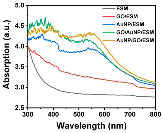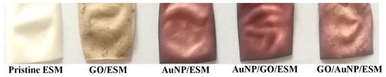 The color of ESM changed from white to brown–yellow after GO nanosheets were coated on the surface of ESM (GO/ESM in Figure 1), indicating that GO nanosheets were combined effectively with ESM. The color of ESM changed from white to wine red after the in situ synthesis of gold nanoparticles (AuNP/ESM in Figure 1). The ESM sample became black–purple when the AuNPs were in situ-synthesized onto the GO-modified ESM (Au/GO/ESM in Figure 1). The AuNP-treated ESM was further coated with GO, which showed a dark color (GO/AuNP/ESM in Figure 1). It should be noted that the color of the GO/ESM became darker during the in situ heating synthesis of AuNPs, implying that GO may be reduced by heat in the presence of ESM, which is similar to the GO reduction on the cotton surface at high temperature []. To investigate the optical properties of the ESM samples, UV-Vis diffusion reflectance absorbance spectra were measured (Figure 2). The pristine ESM displayed absorption in the UV region due to its protein composition. The GO/ESM showed higher absorption in the whole wavelength range compared to the pristine ESM because of the coating of GO nanosheets. The curve of AuNP/ESM presented an absorption band around 540 nm, which is assigned to the LSPR mode of AuNPs on the ESM surface []. A distinct absorption band around 540 nm was observed in the UV-Vis diffusion reflectance absorbance spectra of AuNP/GO/ESM and GO/AuNP/ESM, indicating that the GO coating did not obviously change the LSPR properties of AuNPs. The complex of GO and AuNPs enhanced the UV-Vis absorption of the ESM samples. The spectral data indicates that GO nanosheets were coated on ESM surface, and AuNPs were in situ-synthesized on ESM after heat treatment.