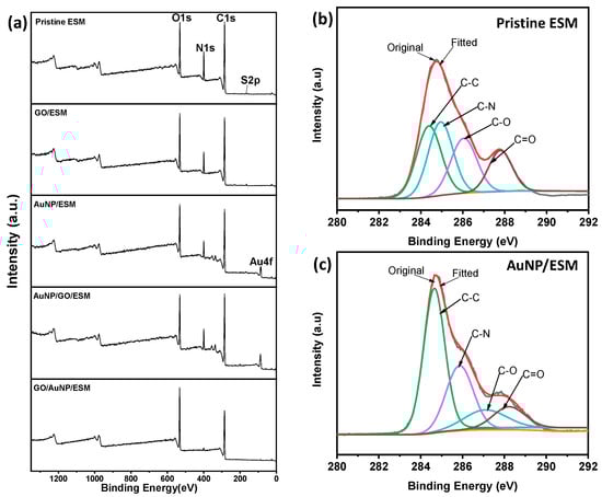 XPS spectra of ESM samples: (a) survey curves, and C1s XPS curve of (b) pristine ESM and (c) AuNP/ESM.