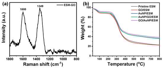 The coating of GO on the surface of ESM was further confirmed by Raman scattering spectroscopy. As shown in Figure 5a, two Raman bands were observed at 1349 and 1600 cm−1, which corresponded to the in-plane bond stretching motion of C sp2 atoms (G band) and the breathing modes of benzenoid rings (D band) of GO []. The result further demonstrated the successful coating of GO nanosheets on ESM. The composition and thermal stability of ESM samples were tested by TGA. The weight loss of the samples below 100 °C is due to the evaporation of the moisture inside samples (Figure 5b). A major weight loss was observed for all the samples and was found from 240 °C to 400 °C, which was attributed to the decomposition of ESM. There was only a slight weight loss with a further increase in the temperature, which indicates the thermal decomposition of the ESM samples was nearly complete at around 400 °C. The residual percentages for pristine ESM, GO/ESM, AuNP/ESM, AuNP/GO/ESM, and GO/AuNP/ESM were 22.73%, 22.31%, 35.92%, 36.39%, and 38.37%, respectively. The ESM samples with the coating of both the AuNPs and GO nanosheets showed higher residual percentages compared to other samples, implying that more nanoparticles remained in the residuals.