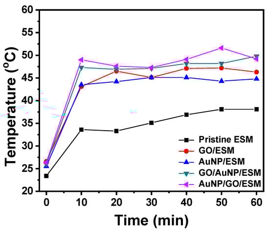 The photothermal effect of the ESM samples was investigated by being subjected to simulated sunlight irradiation. Figure 6 displays the infrared thermal images of the ESM samples before and after light irradiation for 10 min under the xenon lamp. The surface temperatures of the ESM samples increased greatly under the light irradiation. The temperature of the pristine ESM increased from 23.4 to 33.6 °C after light irradiation of 10 min. This is compared with a much higher temperature achieved by GO/ESM, AuNP/ESM, AuNP/GO/ESM, and GO/AuNP/ESM under the same conditions, which was 43.1, 43.5, 47.3, and 49.0 °C, respectively. The thermal images show that the heat distribution of the pristine ESM was over the whole sample as well as the other irradiated area. With photothermal conversion materials, the GO and AuNPs coated ESM showed a concentrated small heat distribution area in the middle of the samples, which suggests that the ESM coated with GO and AuNPs could be used for localized sunlight driven heating. The temperatures of ESM samples varied slightly as the irradiation time was further prolonged (Figure 7), implying that the photothermal conversion reached equilibrium within 10 min. The rapid photothermal conversion of ESM samples facilitates the applications of GO and AuNPs coated ESM. ESM coated with both GO and AuNPs exhibited higher temperatures (51.6 °C) than the ESM with GO or AuNPs only, which reveals that the synergistic effect of GO and AuNPs increased the photothermal efficiency of ESM. The LSPR band of AuNPs located around 540 nm, which was in favor of the sunlight absorption in the visible region.