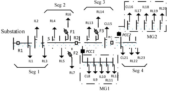 With the advent of smart control, monitoring, and communication systems, distributed energy resources (DERs), which include energy storage system (ESS) and distributed generation (DG), are also being utilized to mitigate different reliability events. DERs can help reduce the impact of sag event by injecting an additional reactive power in case of voltage dips during system contingencies []. The energy storage installed at customer premises can override short- and long-duration reliability events [,]. Microgrid, which consists of controllable loads and DERs integrated at the point of common coupling (PCC) of distribution network, operates in isolated mode during utility supply disturbances (sags and interruptions), thereby protecting critical load against reliability events [,]. DERs that are not part of such microgrids and integrated along a distribution feeder can also operate in an islanded mode to reduce long-duration outages [].