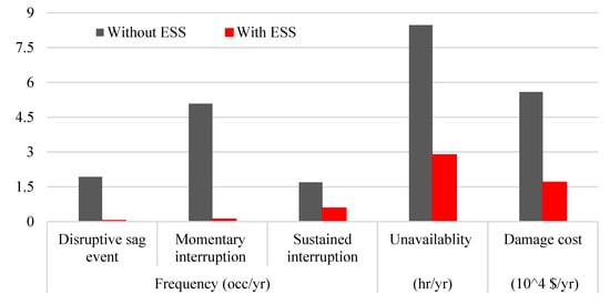 It should be noted that reliability performance of load point is poor, as it is located far from the substation in a radial distribution feeder. Figure 5 shows the reliability indices of IL9 with and without ESS without considering the operation of DERs/microgrids. The y-axis of Figure 5 shows the magnitude of annual outage time, damage cost, and frequency of disruptive sags, momentary, and sustained interruptions. Results indicate that ESS is effective in improving reliability performance in both short- and long-duration reliability events. It should be noted that the frequency of short-duration reliability events is reduced significantly compared to the sustained interruption-based indices. It is because the discharge duration and SOC of ESS can significantly limit the mitigation of sustained interruption but have little impact on short-duration reliability events. The mitigation of sustained interruptions greatly depends on the initial SOC at the time of contingency, efficiency, and discharge duration of BESS. In addition, reliability improvement depends on hardware availability as well.