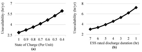 Another study is conducted to analyze the impact of initial SOC at the time of occurrence of contingency and the rated discharge duration of ESS to mitigate long-duration outages. Figure 6a,b, respectively, shows that load point unavailability increases with a decrease in SOC and rated discharge duration in the case of sustained forced outages. The sustained interruption frequency follows a similar trend. This means if ESS is utilized for peak shaving or other application instead of standby mode, ability of ESS mitigating sustained outages reduce. However, it does not significantly affect the mitigation for short-duration reliability events. Given that batteries suffer from degradation and need a periodic replacement due to the limited life cycle, other ESS technologies, such as Flywheel, Magnetic energy storage systems (SMES), Supercapacitor, etc., are also used to protect critical loads. These technologies, however, cannot retain energy for a long duration and, therefore, need to be used with other resources (battery, backup generator, etc.) to reduce the financial impact due to long-duration reliability events.