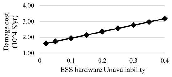 The hardware failure of ESS also plays a vital role in the relative reliability improvement. Both short- and long-duration reliability event-based indices are affected by component failures. A case study was conducted by varying hardware unavailability of ESS and total damage cost incurred to the customer connected at IL9. Figure 7 shows an increase in damage cost with the increase in ESS unavailability. The hardware availability depends on the maintenance practices, configuration of ESS, failure characteristics of components, etc. Results in Figure 7 provide useful information in investing in ESS component reliability.