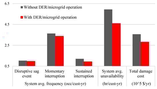 In the deregulated environment, utilities are rewarded/penalized based on their system reliability performance as part of the performance-based rate-making. The integration of DERs/microgrids improves the reliability of the worse performing load points as well as the overall network as reported in Figure 8. Results show decrement in system indices of annual outage time, damage cost, and the frequency of disruptive sag event, momentary and sustained interruptions with DERs/microgrids operation. It should be noted that the reliability profile of load points within segment 1 and 2 remain unchanged since there is no DERs/microgrids integrated.