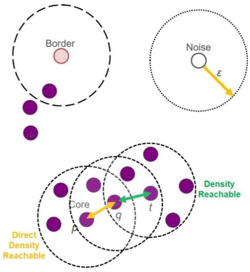 - Ester, M.; Kriegel, H.P.; Sander, J.; Xu, X. A Density-Based Algorithm for Discovering Clusters in Large Spatial Databases with Noise. In Proceedings of the International Conference on Knowledge Discovery and Data Mining, Portland, OR, USA, 2–4 August 1996; pp. 226–231. [Google Scholar]