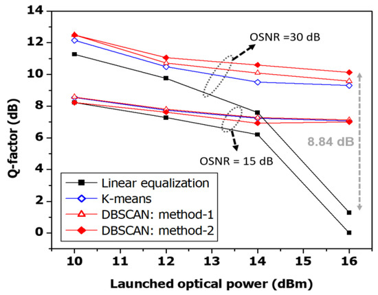 - Zhang, J.; Chen, W.; Gao, M.; Shen, G. K-means-clustering-based fiber nonlinearity equalization techniques for 64-QAM coherent optical communication system. Opt. Express 2017, 25, 27570–27580. [Google Scholar] [CrossRef] [PubMed]