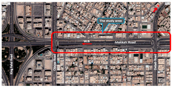 The study area is located in the westbound section of Makkah Road between Dabab Street and Olaya Street, which is a three-lane arterial. It has one on-ramp with two lanes, one off-ramp with two lanes, an auxiliary lane which connects the two ramps, and an adjacent intersection. Figure 1 simply shows the area. Balke et al. [23] established site selection criteria as follows: (i) Peak-period speeds less than 48 km/h, (ii) vehicle flows between 1200 and 1500 veh/h/ln, (iii) high accident rates, and (iv) significant merging problems. According to the Ministry of Transport (MOT) and Arriyadh Development Authority (ADA), this area suffers from significant merging problems that result in LOS F at the weaving segment. Moreover, the average speed is lower than 48 km/h and the flow rate of the right lane of freeway is 1546 veh/h/ln, which is near the criterion from Balke et al. [23].