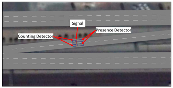 Alternative scenario 3 (fixed time RM, AS-3)—the signal on the ramp operates with minimum red time, following a metering rate prescribed for the particular control period. This pre-timed operation is known as the simplest and least expensive form of RM for construction and installation, as well as the most rigid approach [8]. In this scenario, the red signal will always be active unless at least one vehicle is detected upstream of the signal. The signal has two detection loops, as shown in Figure 4: the first detector (presence detector) senses vehicle access to the signal and the second detector (counting detector) counts the number of vehicles that pass the signal.