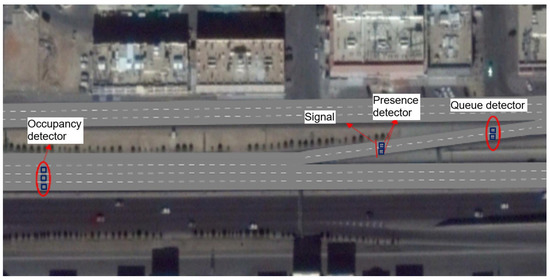 This research uses three detectors. The first detector (occupancy detector) is located on the freeway downstream of the merging area to calculate the occupancy rate in the mainline. The second detector (presence detector) is located right before the signal to sense vehicle approach. The third detector (queue detector) is located at the beginning of the on-ramp to check the vehicle queue length.