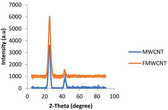 XRD trace of as-received MWCNTs and acid-treated MWCNTs (FMWCNTs).