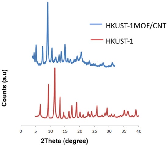 Similar phases were observed in the samples, and a prominent peak of carbon nanotubes was obtained at a 2θ angle of 26.8°. However, it can be noted that the functionalized MWCNT peak at 26.8° increased in intensity compared to the as-received sample. This could have been because of the fact that carbon nanotubes loosen after treatment with acid to form well-ordered MWCNTs, and this is evident in Figure 1A,B [40]. The X-ray diffraction pattern of the as-synthesized MOF and that of the composite sample are shown in Figure 5.