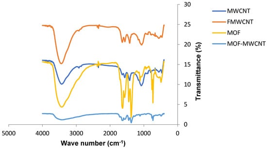 A typical diffraction pattern of Cu3(BTC)2 (H2O)3.xH2O was observed in the virgin MOF samples. The 2θ position of the prominent peaks of HKUST-1 synthesized in this work matched the high-purity HKUST-1 XRD pattern reported in the literature [35,37,38]. The EDS result corroborated the XRD pattern, which gives an indication that no other phase was present in the HKUST-1 sample. On the other hand, HKUST-1 containing functionalized MWCNT samples revealed distinct peaks of HKUST-1. This shows that the carbon nanotube did not prevent the formation of HKUST-1 crystals, but a peak shift was observed in the sample. In addition, the prominent peak of functionalized MWCNTs (observed in Figure 4 at 2θ 26.8°) was greatly reduced in the composite XRD pattern. This could have been because of the relatively low intensity of MWCNTs compared to HKUST-1 MOFs [9]. This observation is reasonably consistent with a report on MOF-5/MWCNT composites [41]. The FTIR spectrums of the as-received MWCNTs, FMWCNTs, HKUST-1 MOFs, and FMWCNT/HKUST-1 composites synthesized in this study are shown in Figure 6.