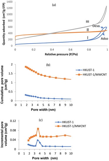 (a) N2 adsorption/desorption isotherms of (I) as-received MWCNTs, (II) HKUST-1, and (III) FMWCNT/HKUST-1, and BJH pore size distributions of MOF and HKUST-1 composite samples; (b) cumulative pore volume; (c) incremental pore volume.