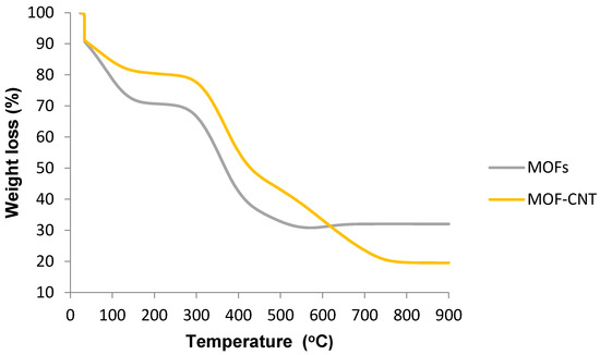 Thermogravimetric analysis of the virgin MOFs and the multiwalled carbon nanotube composites is shown in Figure 8.