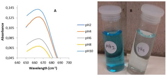 In order to determine the optimal wavelength for the analysis of FMWCNT/HKUST-1, a plot of absorbance as a function of wavelength was generated. Figure 9a shows the adsorption band maxima of the MB solution on the adsorbate at different pH values. Maximum absorption bands of 665, 665, 665, 665, and 664 nm were obtained at pH 2, 4, 6, 8, and 10, respectively. It can be noted that there was no shift in the adsorption band of aqueous MB in the FMWCNT/HKUST-1 composites. Furthermore, the effectiveness of the FMWCNT/HKUST-1 composite in the removal of MB dye was examined by evaluating its partition coefficient (PC). A partition coefficient is a solid–liquid adsorption system that has been defined as the ratio of the adsorbate per unit mass of the adsorbent to its concentration in the liquid phase at equilibrium [47,48]. The partition coefficient (PC) was calculated according to the report of Paulino et al. [49] and Adeyinka and Moodley [50] using different dye concentrations with 100 mg of adsorbent. Partition coefficients (PCs) of 18.89, 12.73, and 10.29 mg/g/µM were obtained for 20, 100, and 200 ppm, respectively. The performance of the FMWCNT/HKUST-1 composite could be attributed to the synergistic effect of FMWCNTs in the virgin HKUST-1 MOF in enhancing the pore structure, which provided more channels for the adsorption of MB molecules. In addition, a maximum adsorption capacity greater than 100 mg/g was obtained for 100 ppm at 25 °C. Figure 9b shows photographs of the MB solution treated with the adsorbent at pH 2 and pH 8.