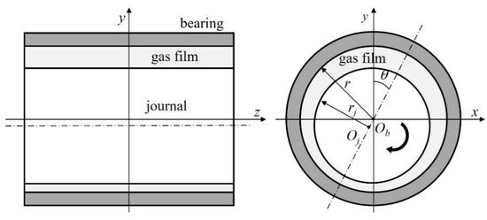 The structural schematic diagram of the gas bearing is shown in Figure 4. For MEMS gas bearing, the scale of the molecular free path cannot be negligible relative to the characteristic film thickness. Previous studies have shown that the flow state in the bearing clearance is a typical slip flow [26], and the simulation accuracy is not good enough to describe the flow state using the traditional Reynolds equation. According to the theory of S. Fukui and R. Kaneko [11,12], the lubrication equation can be obtained by the Boltzmann equation based on the theory of molecular dynamics under any Kn number. Extend the lubrication equation to two-dimensional space and transfer to the cylindrical coordinate system: