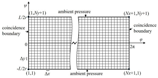 In this paper, the finite element method (FEM) is used to solve Equations (7) and (10). The solution is based on two assumptions: (1) The film pressure does not change in the radial direction; (2) The flow in the film clearance is isothermal. As shown in Figure 5, the cylindrical solution domain is expanded into a rectangular domain and the whole solution domain is discretized by a four-node quadrilateral element, in which the transient and static lubrication equations are solved. Φ is adopted as the interpolation function as well as the weight function in Galerkin integral. Equation (10) can be transformed in any finite element region as: