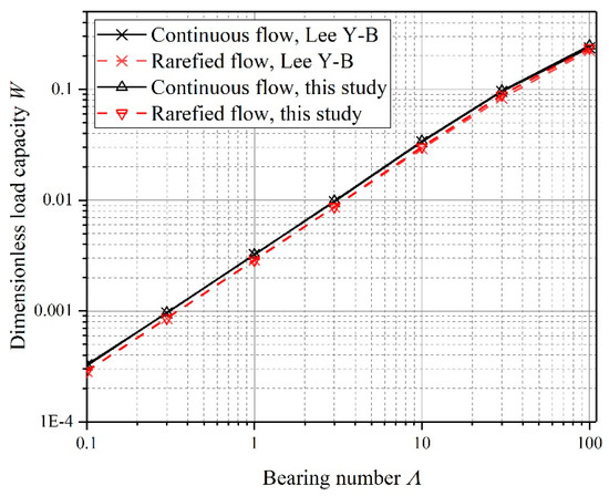 To validate the correctness of the mathematical model and the numerical method in this paper, the test data of this study are compared with the data of Lee Y-B [14]. The numerical analysis method was employed by Lee Y-B to give the variation rule of load capacity with the bearing number considering the rarefaction effect. The investigation data have been cited by many scholars and have strong authority. In this paper, the same geometric and operating parameters as Lee Y-B were used for calculations, as shown in Table 1: