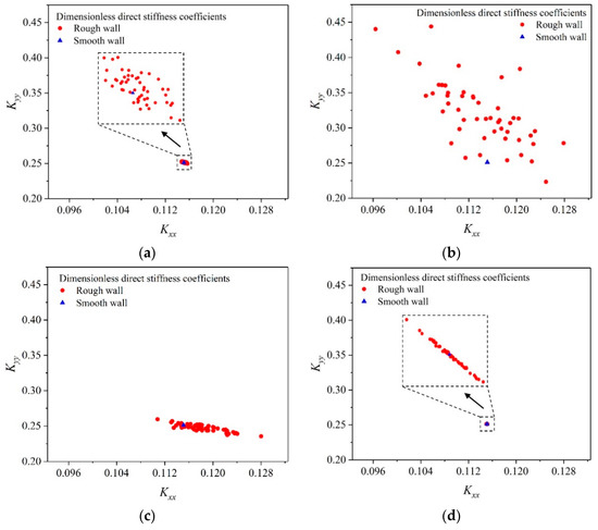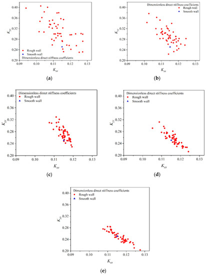 Figure 9 shows the direct stiffness coefficients distribution with wear in different axial regions. When the wear region closes to both ends of the bearing, most of the red (cicle) points are in the upper left of the blue point, which indicates that the Kxx will decrease and Kyy will increase with a high probability. When the wear regions move to the center, more and more red points move to the lower right of the blue point, which indicates that the probability PRB (Kxx > Kxx0) and PRB (Kyy < Kyy0) will increase.