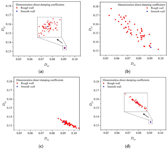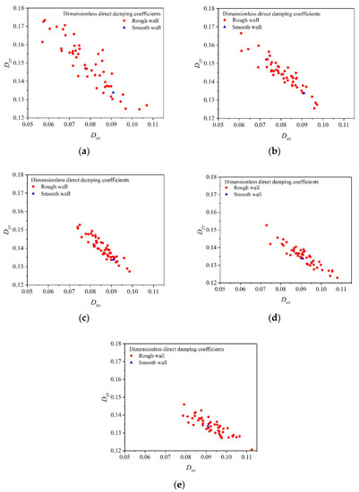 Figure 11 shows the direct damping coefficients distribution characteristics of Dxx and Dyy. When the wear region is near both ends of the bearing, there are more test points on the upper left side of the reference point, indicating that Dxx will decrease and Dyy will increase with a high probability. As the wear position shifts toward the center, there are more test points on the lower right side of the reference point, which indicates that the probability PRB (Dxx > Dxx0) and PRB (Dyy < Dyy0) will increase.