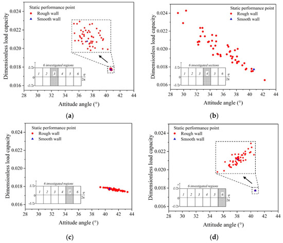 Figure 8 shows the static performance point distribution of the MEMS gas bearing with wear in different axial regions. The horizontal ordinate represents the attitude angle and the vertical ordinate represents the dimensionless load capacity. In each case, the static performances of 50 working conditions were calculated to explore the static performance range of the bearing. The red circle points are the static performance points with rough walls and the blue triangle point is the static performance point with smooth walls.