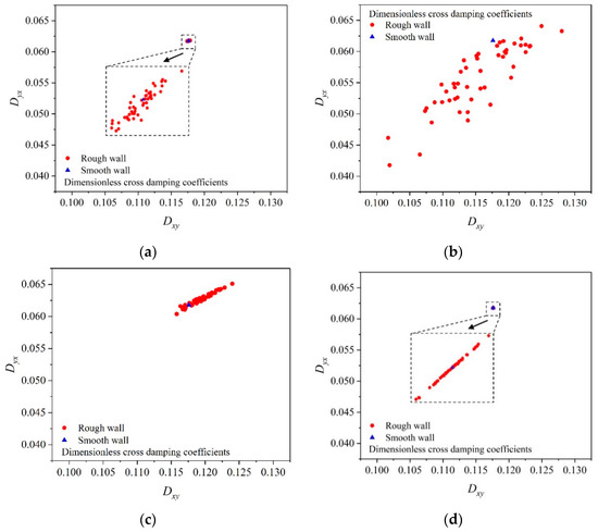 Figure 12 shows the cross damping coefficients distribution characteristics of Dxy and Dyx. When the wear region is near both ends of the bearing, there are more test points on the lower left side of the reference point, indicating that both Dxy and Dyy will decrease with a high probability. As the wear position shifts toward the center, the occurrence frequency of the test points at the upper right side of the reference point increases, which indicates that the probability PRB (Dxx > Dxx0) and PRB (Dyy > Dyy0) will increase.