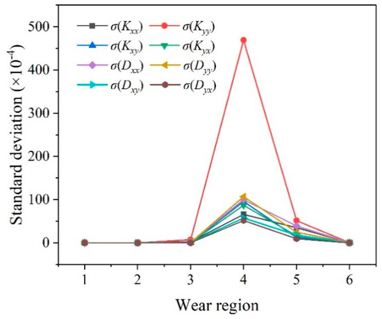 Figure 19 shows the standard deviation of the eight dimensionless dynamic coefficients when there is wear in different circumferential positions. The conclusion can be drawn that all the sample standard deviations of the eight dynamic coefficients reach the maximum when there is wear in region 4. The results above indicate the uncertainty of the dynamic characteristic reaches the largest, which means the influence of wear on the bearing is most obvious in this case.