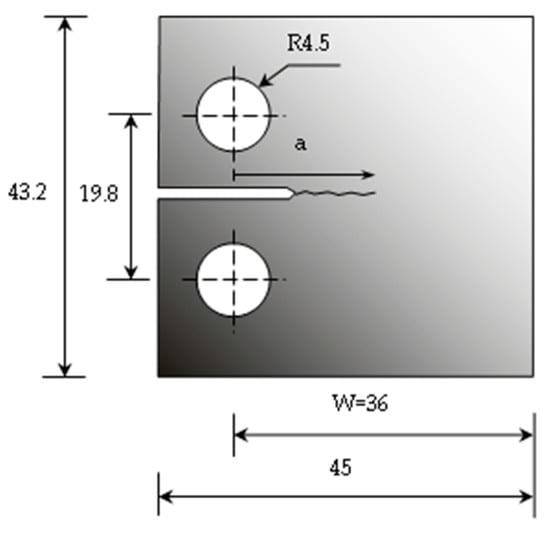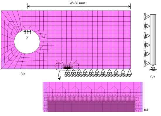 The C(T) specimen (Figure 1) presents geometric, material and loading symmetries; therefore, 1/4 of the specimen was modeled numerically considering adequate boundary conditions, as indicated in Figure 5a,b. A pure plane stress state was simulated by assuming a small thickness equal to 0.1 mm. Several initial crack lengths a0 were considered, equal to 7 mm, 10 mm, 13 mm, 16 mm, 19 mm, 22 mm and 24 mm, to replicate a wide range of experimental crack lengths. The simulations were done under load control, similar to the experimental tests. The maximum and minimum values of the remote load were defined considering the experimental loads listed in Table 2.