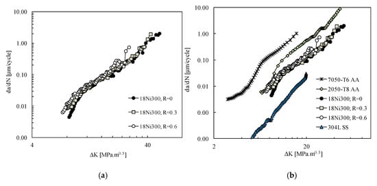 (a) da/dN-ΔK curves (18Ni300 steel; t = 6 mm). (b) Effect of material on da/dN-ΔK plots (R = 0.1; R = 0.05 for the 18Ni300).