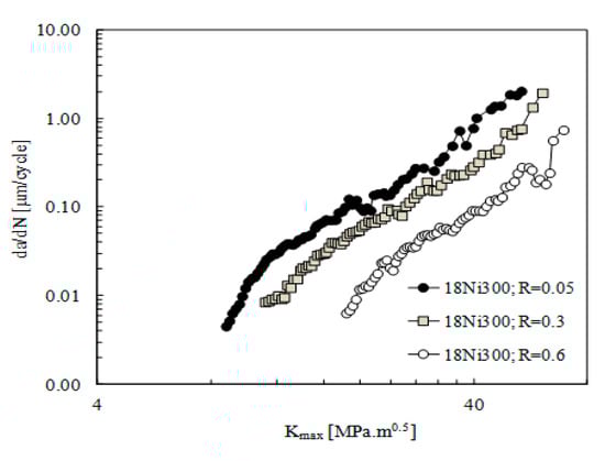 da/dN-Kmax curves (18Ni300 steel; t = 6 mm).