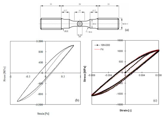 (a) Low cycle fatigue specimens. (b) Stress-strain plot (Δε = ± 0.8%). (c) Experimental versus fitted curve (18Ni300 steel).