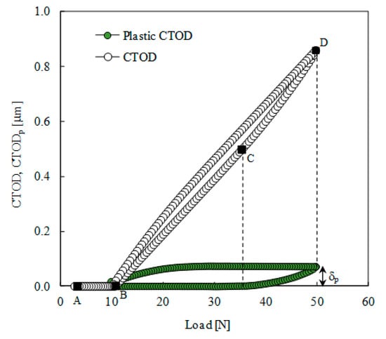 Figure 6 presents a typical numerical result of CTOD as a function of the remote stress, obtained for an initial crack length a0 = 24 mm, followed by 20 crack propagations (Δa = 160 μm); the CTOD was assessed at the first node located behind the crack tip, at a distance of 8 μm from the tip, as is schematically indicated, which presents the most sensitivity to crack tip phenomena. The crack is closed between A and B, for relatively low loads, i.e., the CTOD equals zero. The load increase opens the crack at point B. After point B, the crack opening evolves linearly with load increase up to point C, which is the boundary of the linear elastic regime. The range of loads between the opening load and the onset of plastic deformation was used to predict the fatigue threshold, as will be described later. A progressive increase of plastic deformation is found between points C and D, achieving its maximum value for the maximum load. The load decrease generates reversed elastic deformation with the same rate observed during loading. The subsequent load decrease produces reversed plastic deformation. Figure 6 also plots the variation of plastic CTOD. Plastic deformation initiates at point C, achieving its maximum value at maximum load. The plastic CTOD range, δp, which is correlated with fatigue crack propagation rate, is shown in Figure 6. It should be noted that crack closure is implicit in the value of δp. Increasing the crack closure phenomenon reduces the effective range of stress, also reducing the total CTOD and the plastic CTOD. In the absence of crack closure, the entire load cycle is felt by the crack tip. The plastic CTOD range also excludes the elastic deformation, which is not supposed to affect FCG.
