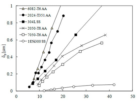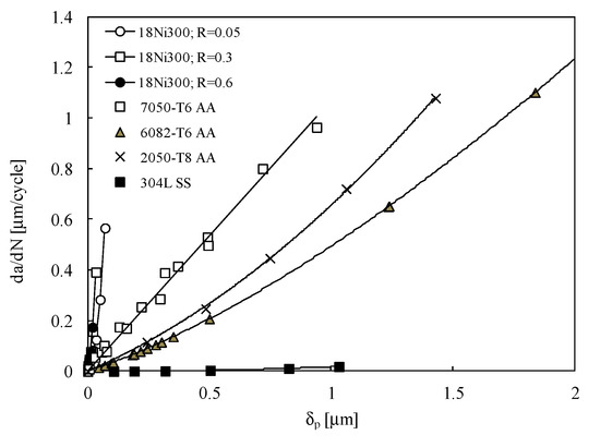 where the units of da/dN and δp are μm/cycle and μm, respectively. The correlation coefficient is R2 = 0.9842 and its validity is limited to δp in the range 0–0.8 μm. Figure 9 also presents results for other materials. The material models for the 304L stainless steel and the 18Ni300 steel were obtained using C(T) specimens, while the aluminum alloys were studied with M(T) specimens. For the same δp, the fatigue crack growth rate is significantly higher for the laser sintered material (18Ni300) than for the remaining materials.